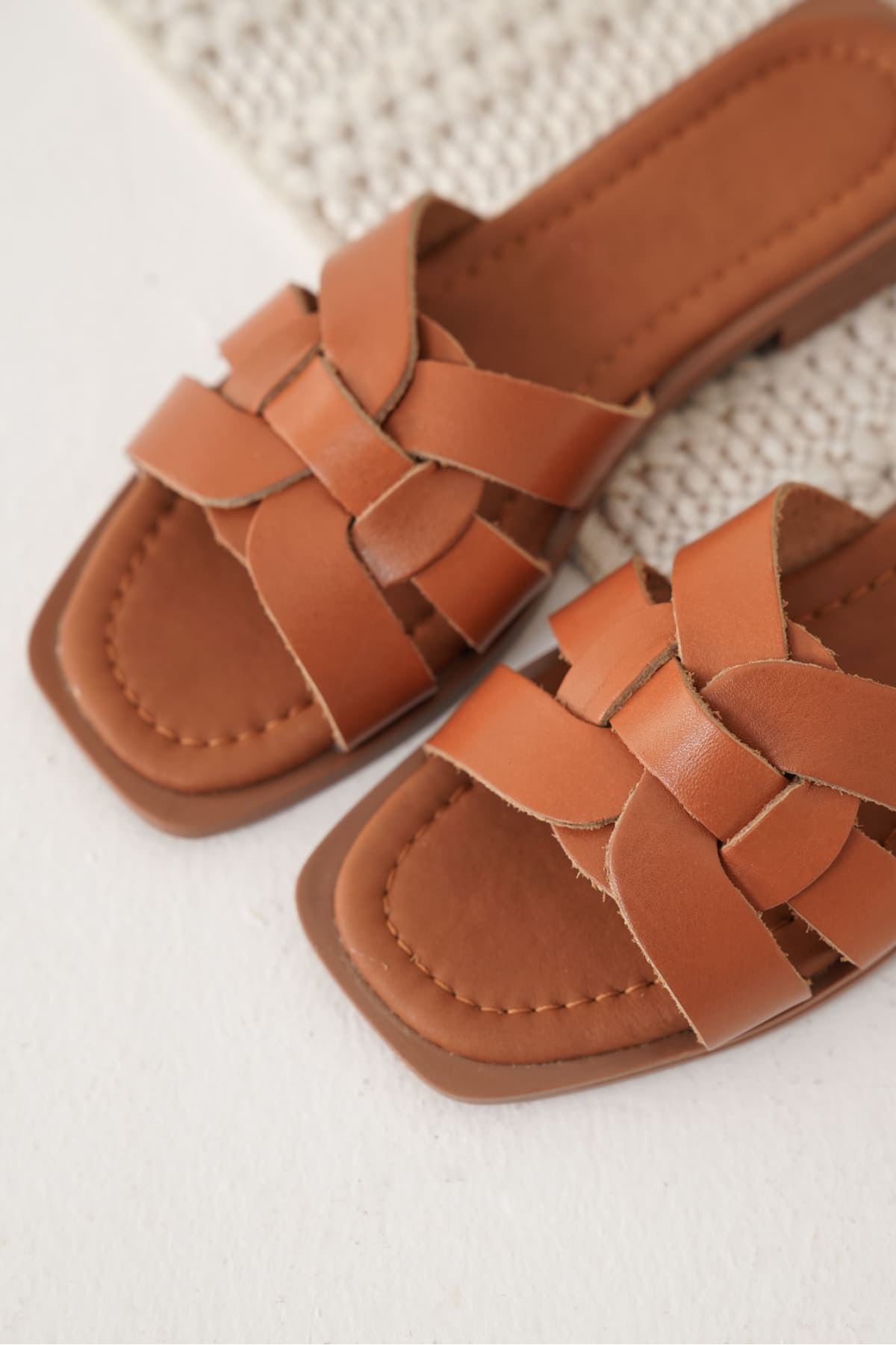 Fayn Acı Kahve Örgü Desenli Hakiki Deri Terlik